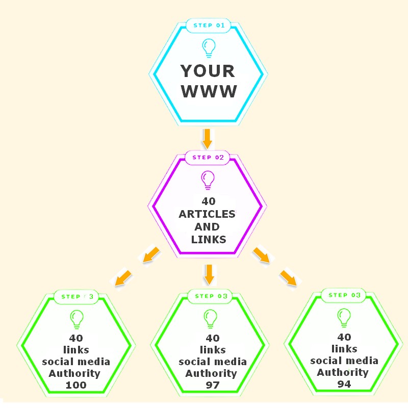 You will get a pyramid of 160 links. 40 direct links and 120 social media links to 40 articles